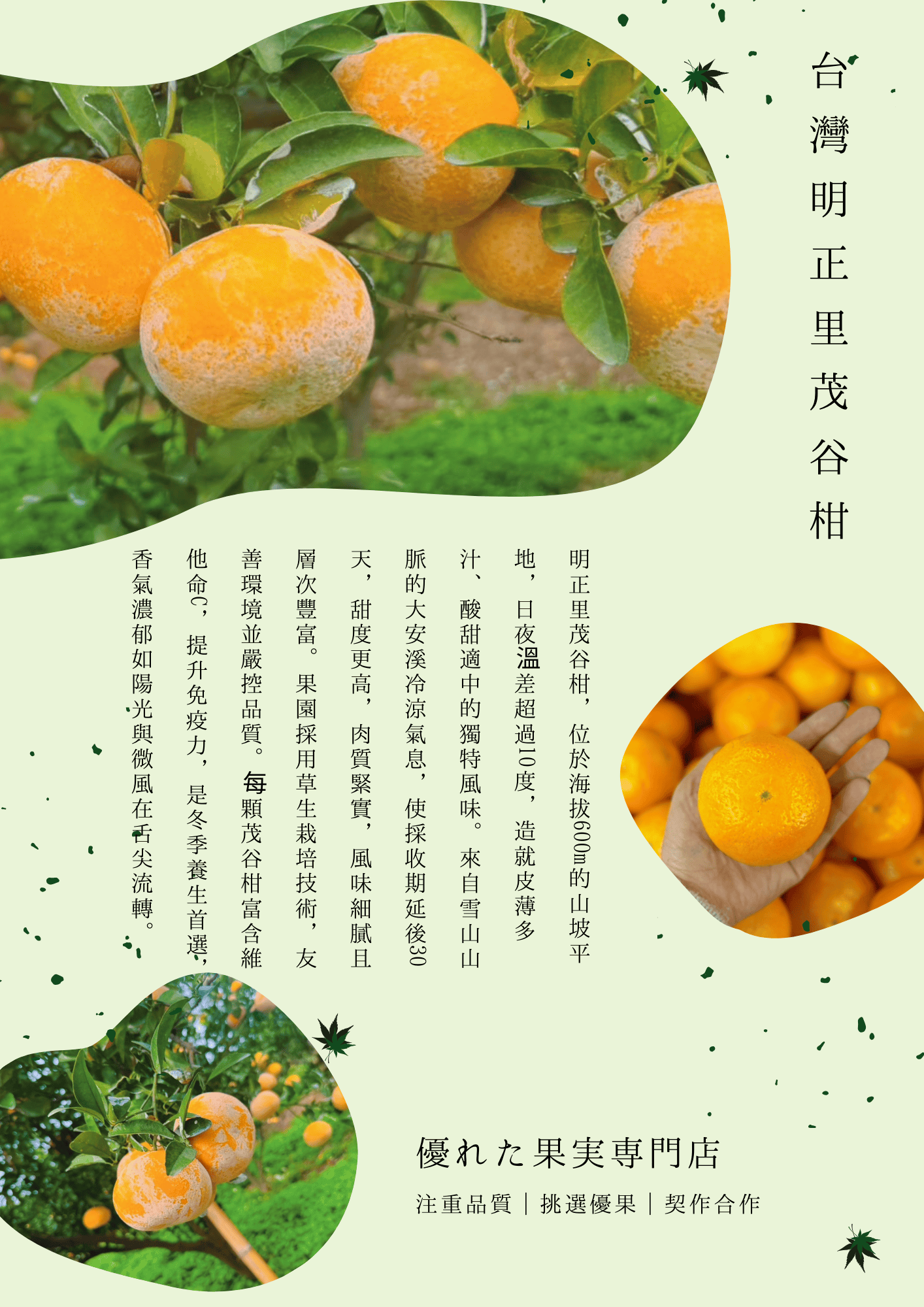 無論是酸甜開胃還是送禮表心意,茂谷柑都是不可錯過的選擇!讓這個冬天多一份滋味與暖意,現在就訂購,品味明正里高山的幸福果實吧!